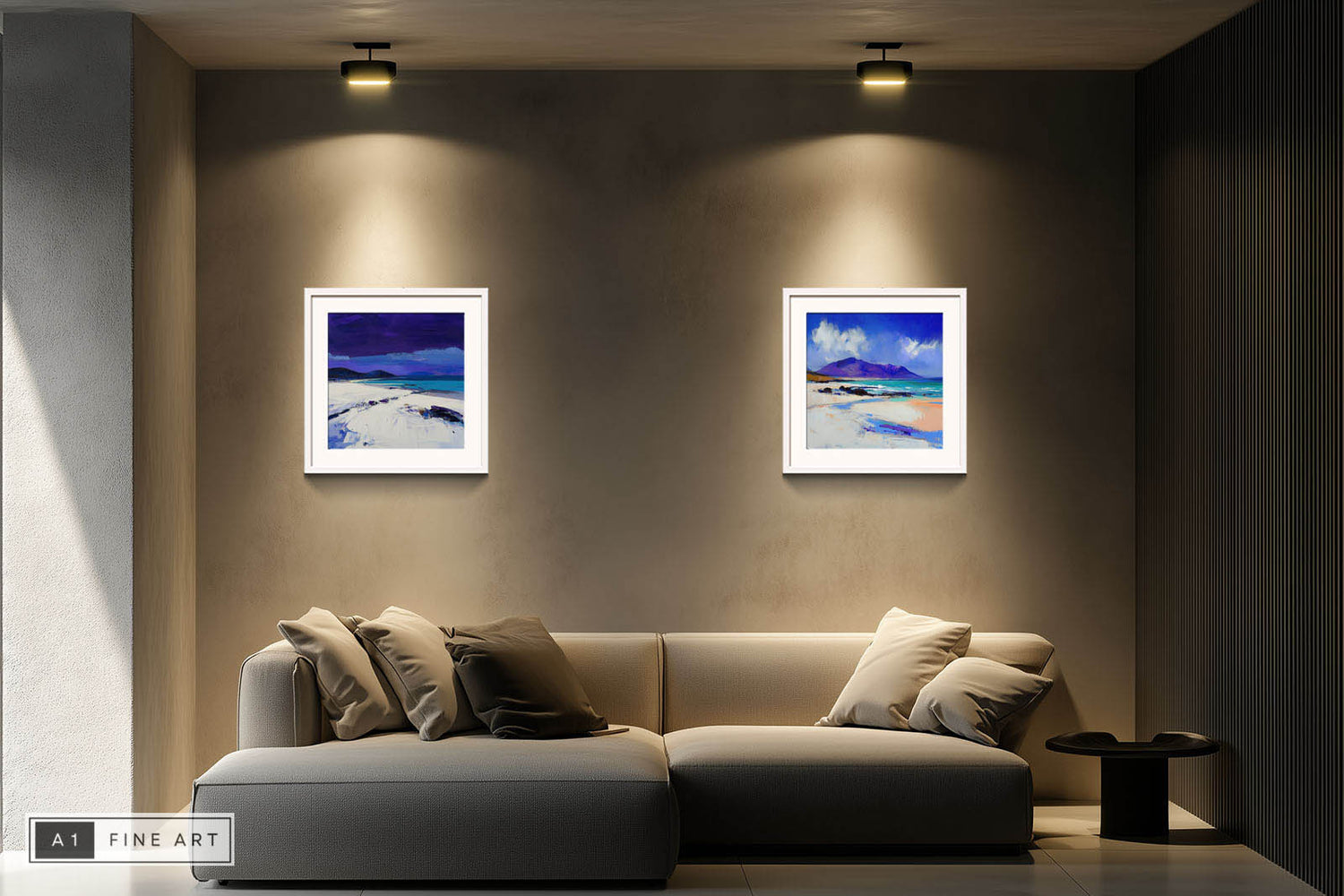 Nicky Ingham paints dreamlike scenes of Scotland’s sandy beaches, using her signature palette of blues and purples to create a sense of tranquility and wonder. Her work blends color and atmosphere beautifully, transporting viewers into serene and ethereal coastal landscapes.